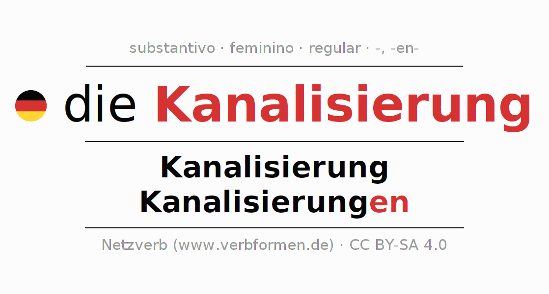 A declinação do substantivo Kanalisierung (canalização) está no genitivo singular Kanalisierung e no nominativo plural Kanalisierungen . O substantivo fraco Kanalisierung é declinado com a terminação -/en. O gênero gramatical de Kanalisierung é feminino e o artigo definido é "die". Não se pode somente declinar o substantivo Kanalisierung mas sim todos os substantivos em alemão. Comentários ☆