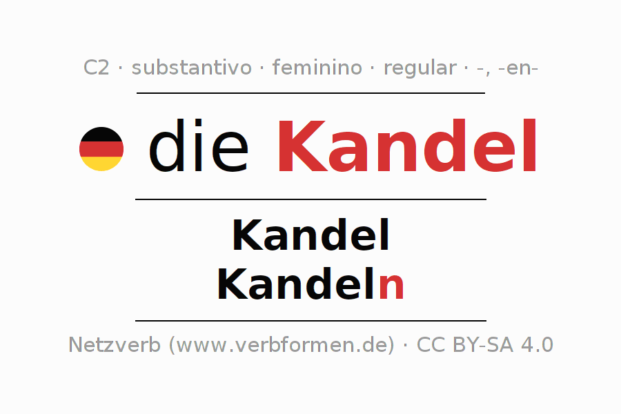 Declinação de die Kandel é apresentada em uma tabela com todas as formas no singular e no plural (plural) e em todos os quatro casos: nominativo (1º caso), genitivo (2º caso), dativo (3º caso) e acusativo (4º caso) . Especialmente para os alunos de alemão, a correta declinação da palavra die Kandel é fundamental.