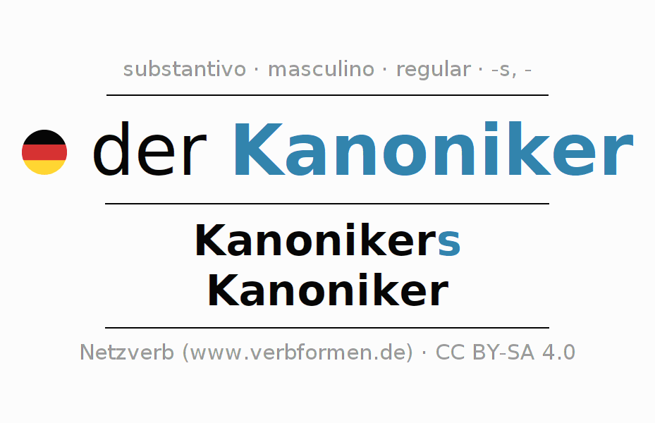 A declinação do substantivo Kanoniker (cânonigo) está no genitivo singular Kanonikers e no nominativo plural Kanoniker . O substantivo forte Kanoniker é declinado com a terminação s/-. O gênero gramatical de Kanoniker é masculino e o artigo definido é 'der'. Não se pode somente declinar o substantivo Kanoniker mas sim todos os substantivos em alemão. Comentários ☆
