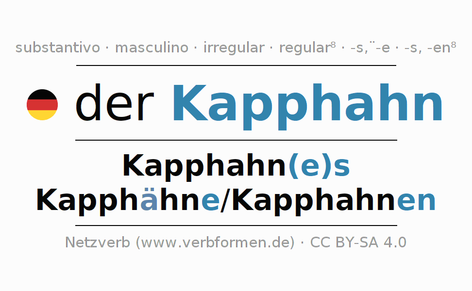 Declinação de Kapphahn é apresentada em uma tabela com todas as formas no singular e no plural (plural) e em todos os quatro casos: nominativo (1º caso), genitivo (2º caso), dativo (3º caso) e acusativo (4º caso) . Especialmente para os alunos de alemão, a correta declinação da palavra Kapphahn é fundamental.