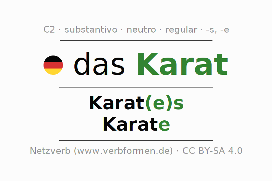 A declinação do substantivo Karat (quilate, unidade de medida de ouro) está no genitivo singular Karat(e)s e no nominativo plural Karate . O substantivo forte Karat é declinado com a terminação es/e. Mas pode também ser usado para outros fins. O gênero gramatical de Karat é neutro e o artigo definido é "das". Não se pode somente declinar o substantivo Karat mas sim todos os substantivos em alemão. O substantivo faz parte do vocabulário referente ao Certificado em Alemão do Nível C2. Comentários ☆