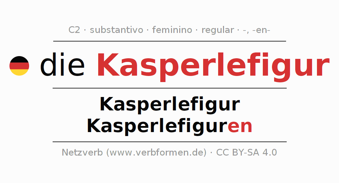 Declinação de Kasperlefigur é apresentada em uma tabela com todas as formas no singular e no plural (plural) e em todos os quatro casos: nominativo (1º caso), genitivo (2º caso), dativo (3º caso) e acusativo (4º caso) . Especialmente para os alunos de alemão, a correta declinação da palavra Kasperlefigur é fundamental.