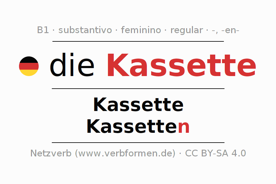 A declinação do substantivo Kassette (cassete, caixa) está no genitivo singular Kassette e no nominativo plural Kassetten . O substantivo fraco Kassette é declinado com a terminação -/n. O gênero gramatical de Kassette é feminino e o artigo definido é "die". Não se pode somente declinar o substantivo Kassette mas sim todos os substantivos em alemão. O substantivo faz parte do vocabulário referente ao Certificado em Alemão do Nível B1. Comentários ☆
