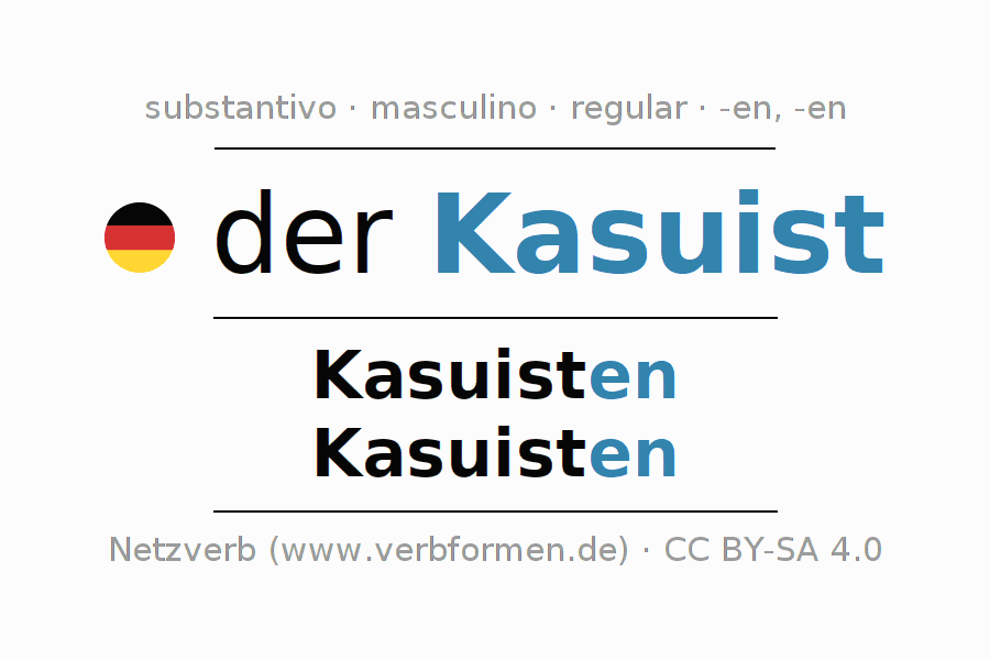 A declinação do substantivo Kasuist (casuista) está no genitivo singular Kasuisten e no nominativo plural Kasuisten . O substantivo fraco Kasuist é declinado com a terminação en/en. O gênero gramatical de Kasuist é masculino e o artigo definido é 'der'. Não se pode somente declinar o substantivo Kasuist mas sim todos os substantivos em alemão. Comentários ☆