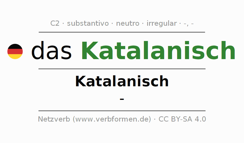 A declinação do substantivo Katalanisch (catalão, Abertura Catalã) está no genitivo singular Katalanisch e no nominativo plural - . O substantivo Katalanisch é declinado com as terminações -/-. Não há formas no plural. O gênero gramatical de Katalanisch é neutro e o artigo definido é "das". Não se pode somente declinar o substantivo Katalanisch mas sim todos os substantivos em alemão. O substantivo faz parte do vocabulário referente ao Certificado em Alemão do Nível C2. Comentários ☆