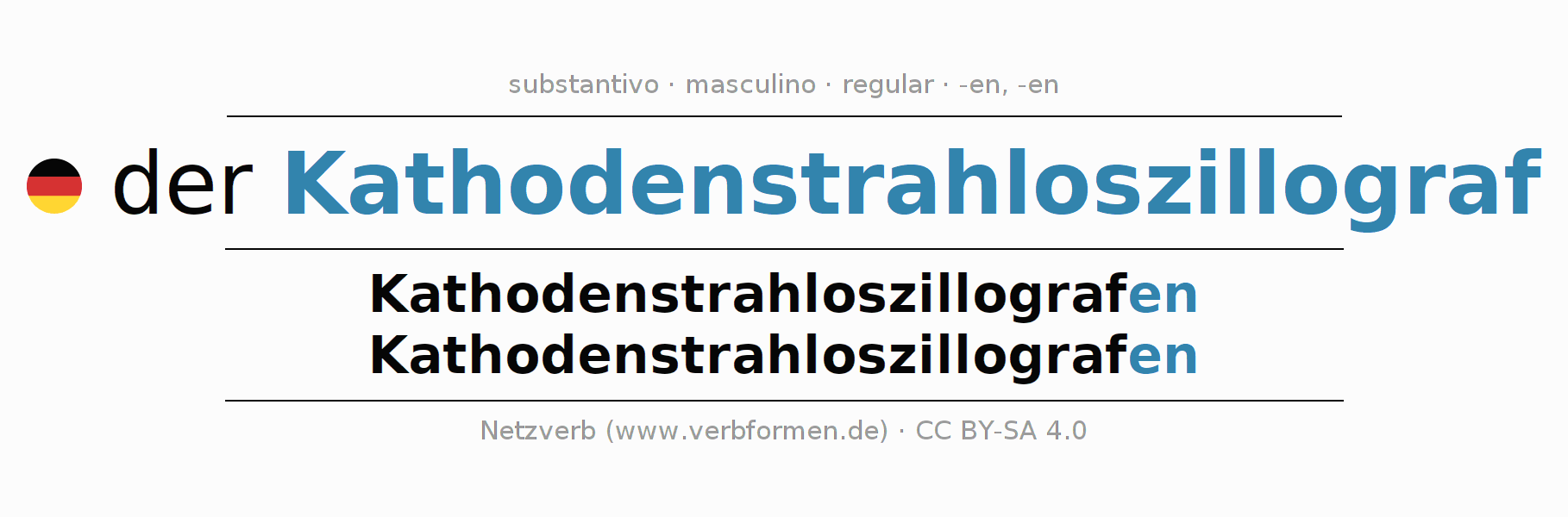 Declinação de Kathodenstrahloszillograf é apresentada em uma tabela com todas as formas no singular e no plural (plural) e em todos os quatro casos: nominativo (1º caso), genitivo (2º caso), dativo (3º caso) e acusativo (4º caso) . Especialmente para os alunos de alemão, a correta declinação da palavra Kathodenstrahloszillograf é fundamental.