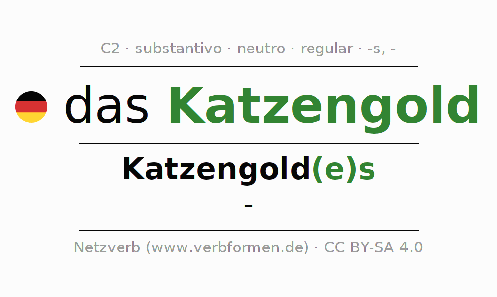 Declinação de Katzengold é apresentada em uma tabela com todas as formas no singular e no plural (plural) e em todos os quatro casos: nominativo (1º caso), genitivo (2º caso), dativo (3º caso) e acusativo (4º caso) . Especialmente para os alunos de alemão, a correta declinação da palavra Katzengold é fundamental.