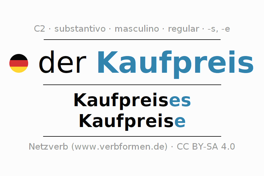 Declinação de Kaufpreis é apresentada em uma tabela com todas as formas no singular e no plural (plural) e em todos os quatro casos: nominativo (1º caso), genitivo (2º caso), dativo (3º caso) e acusativo (4º caso) . Especialmente para os alunos de alemão, a correta declinação da palavra Kaufpreis é fundamental.