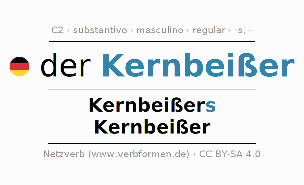 A declinação do substantivo Kernbeißer (bico-grossudo, pássaro bico-de-ferro) está no genitivo singular Kernbeißers e no nominativo plural Kernbeißer . O substantivo forte Kernbeißer é declinado com a terminação s/-. O gênero gramatical de Kernbeißer é masculino e o artigo definido é 'der'. Não se pode somente declinar o substantivo Kernbeißer mas sim todos os substantivos em alemão. O substantivo faz parte do vocabulário referente ao Certificado em Alemão do Nível C2. Comentários ☆