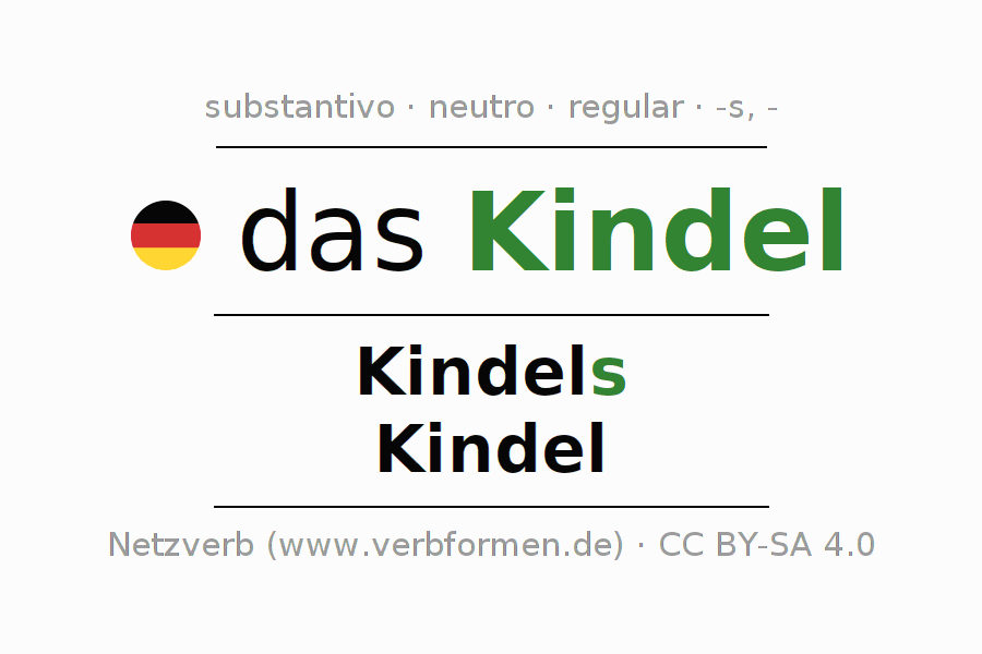 A declinação do substantivo Kindel está no genitivo singular Kindels e no nominativo plural Kindel . O substantivo forte Kindel é declinado com a terminação s/-. O gênero gramatical de Kindel é neutro e o artigo definido é "das". Não se pode somente declinar o substantivo Kindel mas sim todos os substantivos em alemão. Comentários ☆