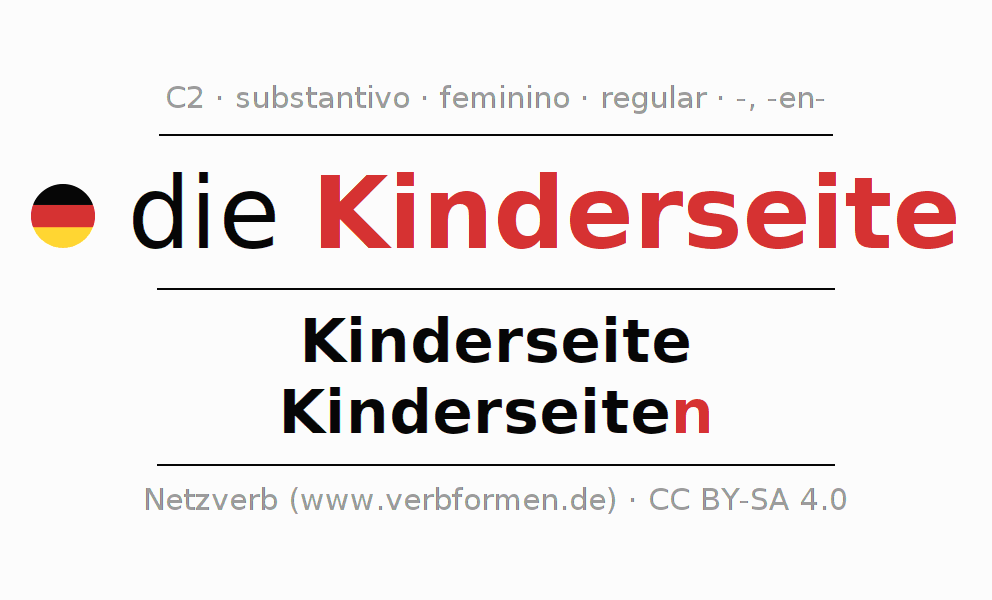 Declinação de Kinderseite é apresentada em uma tabela com todas as formas no singular e no plural (plural) e em todos os quatro casos: nominativo (1º caso), genitivo (2º caso), dativo (3º caso) e acusativo (4º caso) . Especialmente para os alunos de alemão, a correta declinação da palavra Kinderseite é fundamental.