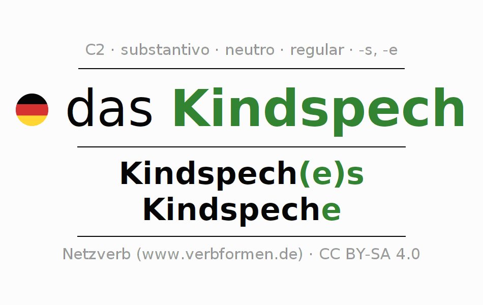 Declinação de Kindspech é apresentada em uma tabela com todas as formas no singular e no plural (plural) e em todos os quatro casos: nominativo (1º caso), genitivo (2º caso), dativo (3º caso) e acusativo (4º caso) . Especialmente para os alunos de alemão, a correta declinação da palavra Kindspech é fundamental.