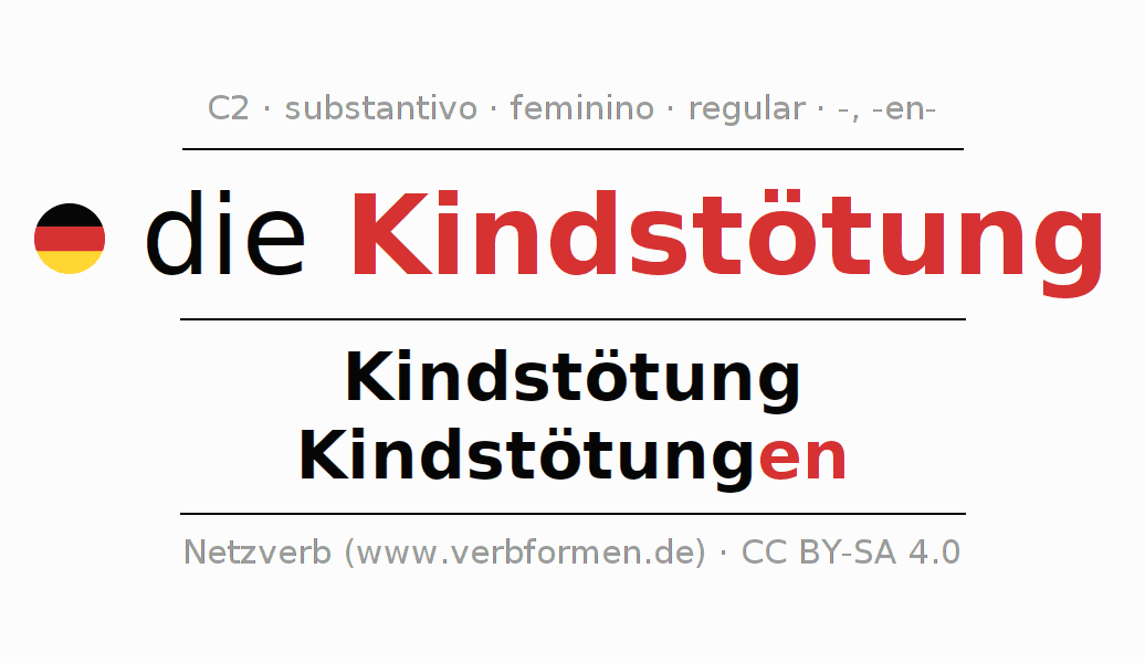 Declinação de Kindstötung é apresentada em uma tabela com todas as formas no singular e no plural (plural) e em todos os quatro casos: nominativo (1º caso), genitivo (2º caso), dativo (3º caso) e acusativo (4º caso) . Especialmente para os alunos de alemão, a correta declinação da palavra Kindstötung é fundamental.