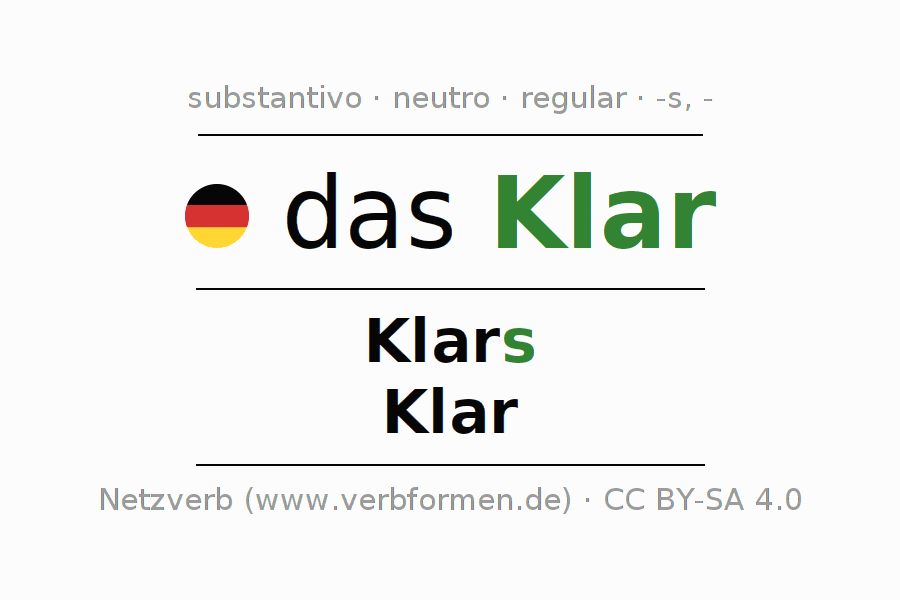 A declinação do substantivo Klar está no genitivo singular Klars e no nominativo plural Klar . O substantivo forte Klar é declinado com a terminação s/-. O gênero gramatical de Klar é neutro e o artigo definido é "das". Não se pode somente declinar o substantivo Klar mas sim todos os substantivos em alemão. Comentários ☆