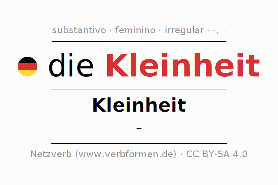A declinação do substantivo Kleinheit (pequenez, insignificância) está no genitivo singular Kleinheit e no nominativo plural - . O substantivo Kleinheit é declinado com as terminações -/-. Não há formas no plural. O gênero gramatical de Kleinheit é feminino e o artigo definido é "die". Não se pode somente declinar o substantivo Kleinheit mas sim todos os substantivos em alemão. Comentários ☆