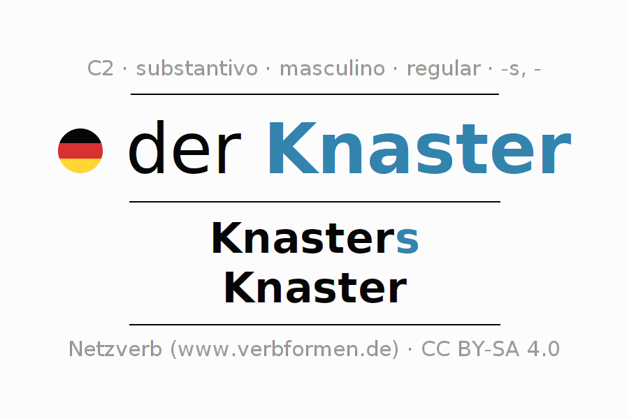 Declinação de Knaster é apresentada em uma tabela com todas as formas no singular e no plural (plural) e em todos os quatro casos: nominativo (1º caso), genitivo (2º caso), dativo (3º caso) e acusativo (4º caso) . Especialmente para os alunos de alemão, a correta declinação da palavra Knaster é fundamental.