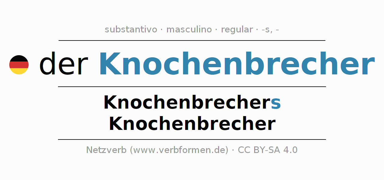 Declinação de Knochenbrecher é apresentada em uma tabela com todas as formas no singular e no plural (plural) e em todos os quatro casos: nominativo (1º caso), genitivo (2º caso), dativo (3º caso) e acusativo (4º caso) . Especialmente para os alunos de alemão, a correta declinação da palavra Knochenbrecher é fundamental.