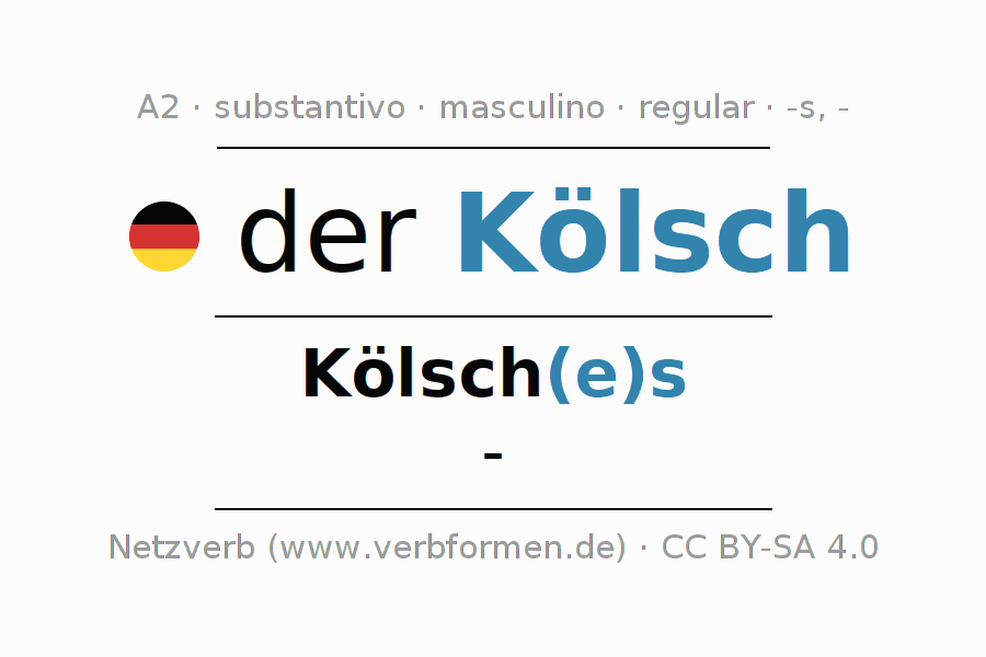 Declinação de der Kölsch é apresentada em uma tabela com todas as formas no singular e no plural (plural) e em todos os quatro casos: nominativo (1º caso), genitivo (2º caso), dativo (3º caso) e acusativo (4º caso) . Especialmente para os alunos de alemão, a correta declinação da palavra der Kölsch é fundamental.