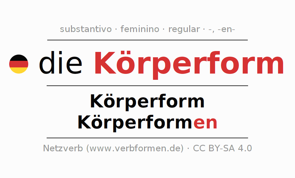 A declinação do substantivo Körperform (forma corporal) está no genitivo singular Körperform e no nominativo plural Körperformen . O substantivo fraco Körperform é declinado com a terminação -/en. O gênero gramatical de Körperform é feminino e o artigo definido é "die". Não se pode somente declinar o substantivo Körperform mas sim todos os substantivos em alemão. Comentários ☆