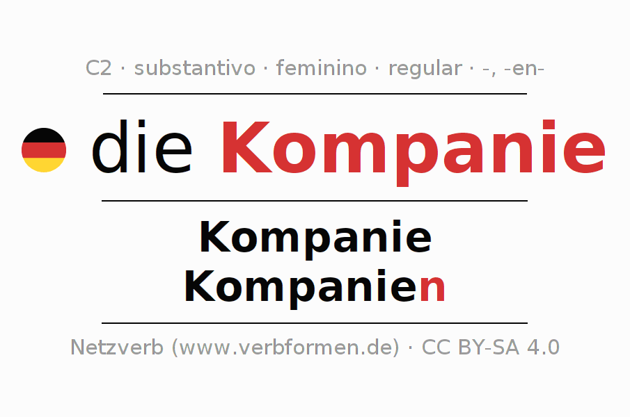 Declinação de Kompanie é apresentada em uma tabela com todas as formas no singular e no plural (plural) e em todos os quatro casos: nominativo (1º caso), genitivo (2º caso), dativo (3º caso) e acusativo (4º caso) . Especialmente para os alunos de alemão, a correta declinação da palavra Kompanie é fundamental.