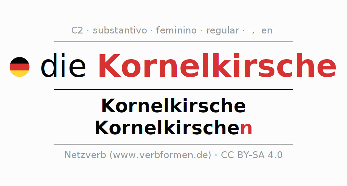 Declinação de Kornelkirsche é apresentada em uma tabela com todas as formas no singular e no plural (plural) e em todos os quatro casos: nominativo (1º caso), genitivo (2º caso), dativo (3º caso) e acusativo (4º caso) . Especialmente para os alunos de alemão, a correta declinação da palavra Kornelkirsche é fundamental.