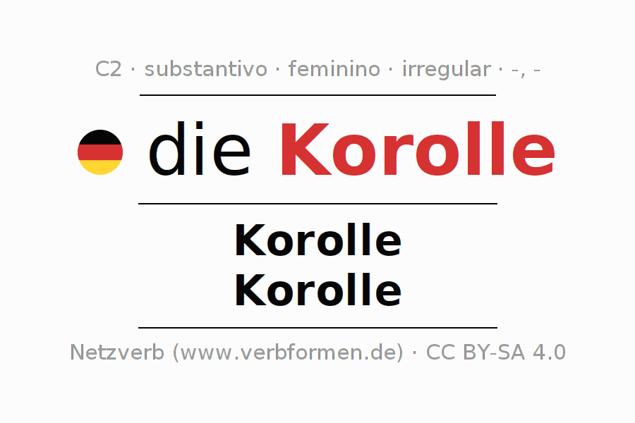 A declinação do substantivo Korolle (corola) está no genitivo singular Korolle e no nominativo plural Korolle . O substantivo Korolle é declinado com as terminações -/-. O gênero gramatical de Korolle é feminino e o artigo definido é "die". Não se pode somente declinar o substantivo Korolle mas sim todos os substantivos em alemão. O substantivo faz parte do vocabulário referente ao Certificado em Alemão do Nível C2. Comentários ☆