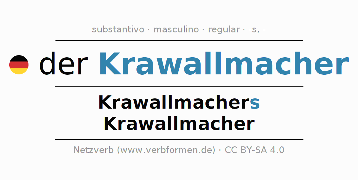 A declinação do substantivo Krawallmacher (agitador, arruaceiro) está no genitivo singular Krawallmachers e no nominativo plural Krawallmacher . O substantivo forte Krawallmacher é declinado com a terminação s/-. O gênero gramatical de Krawallmacher é masculino e o artigo definido é 'der'. Não se pode somente declinar o substantivo Krawallmacher mas sim todos os substantivos em alemão. Comentários ☆