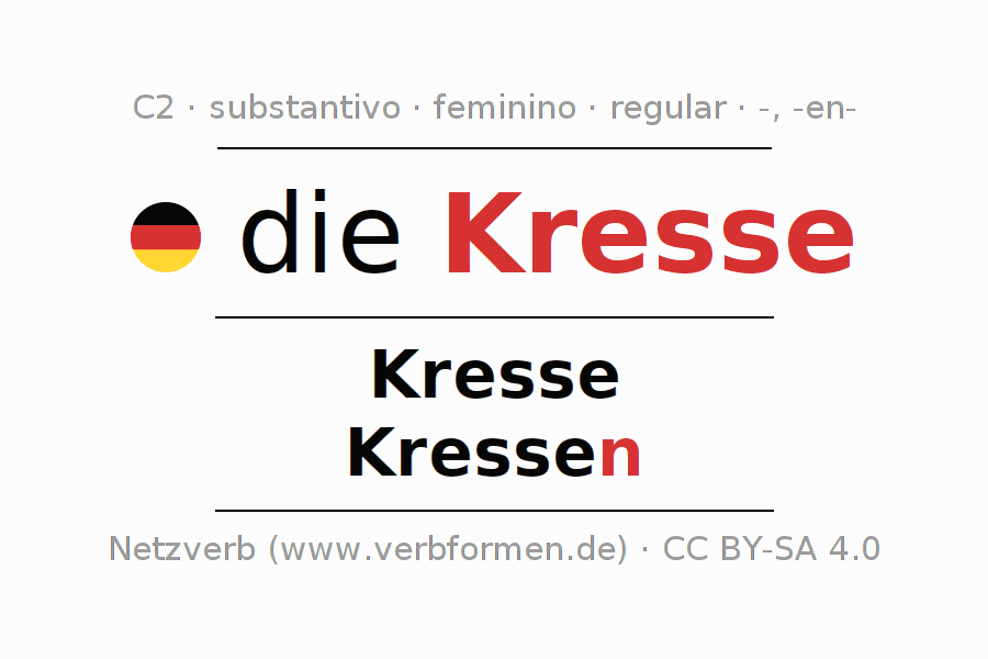 Declinação de Kresse é apresentada em uma tabela com todas as formas no singular e no plural (plural) e em todos os quatro casos: nominativo (1º caso), genitivo (2º caso), dativo (3º caso) e acusativo (4º caso) . Especialmente para os alunos de alemão, a correta declinação da palavra Kresse é fundamental.