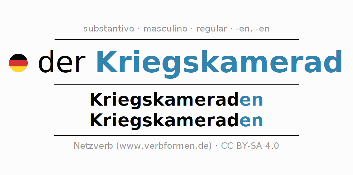 A declinação do substantivo Kriegskamerad (camarada de guerra) está no genitivo singular Kriegskameraden e no nominativo plural Kriegskameraden . O substantivo fraco Kriegskamerad é declinado com a terminação en/en. O gênero gramatical de Kriegskamerad é masculino e o artigo definido é 'der'. Não se pode somente declinar o substantivo Kriegskamerad mas sim todos os substantivos em alemão. Comentários ☆