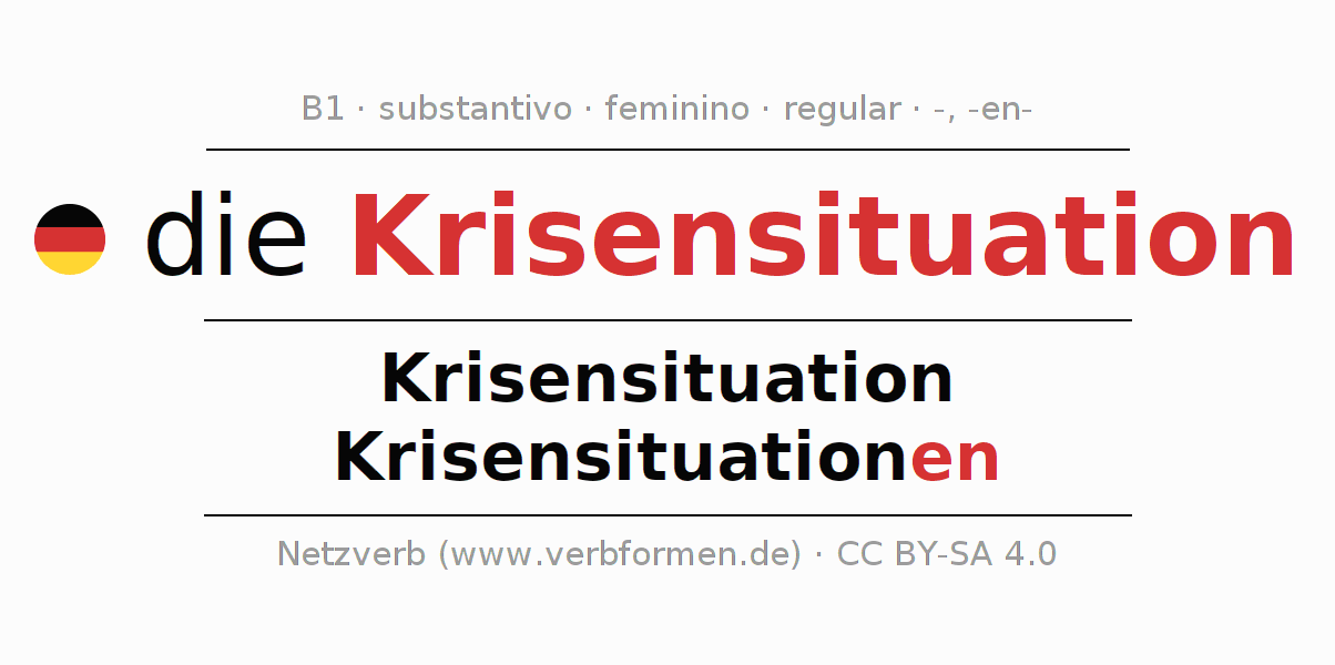 A declinação do substantivo Krisensituation (situação crítica, situação de crise) está no genitivo singular Krisensituation e no nominativo plural Krisensituationen . O substantivo fraco Krisensituation é declinado com a terminação -/en. O gênero gramatical de Krisensituation é feminino e o artigo definido é "die". Não se pode somente declinar o substantivo Krisensituation mas sim todos os substantivos em alemão. O substantivo faz parte do vocabulário referente ao Certificado em Alemão do Nível B1. Comentários ☆