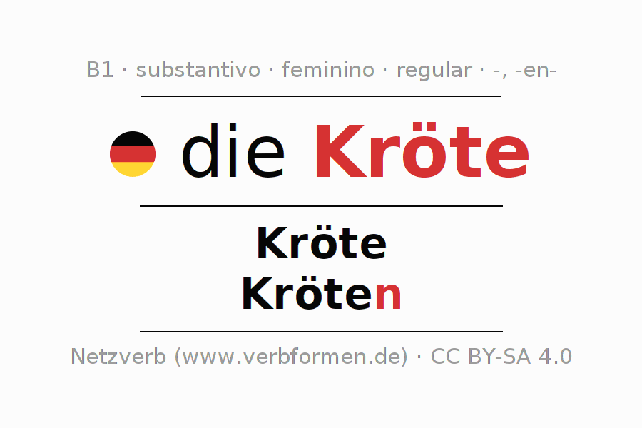 Declinação de Kröte é apresentada em uma tabela com todas as formas no singular e no plural (plural) e em todos os quatro casos: nominativo (1º caso), genitivo (2º caso), dativo (3º caso) e acusativo (4º caso) . Especialmente para os alunos de alemão, a correta declinação da palavra Kröte é fundamental.