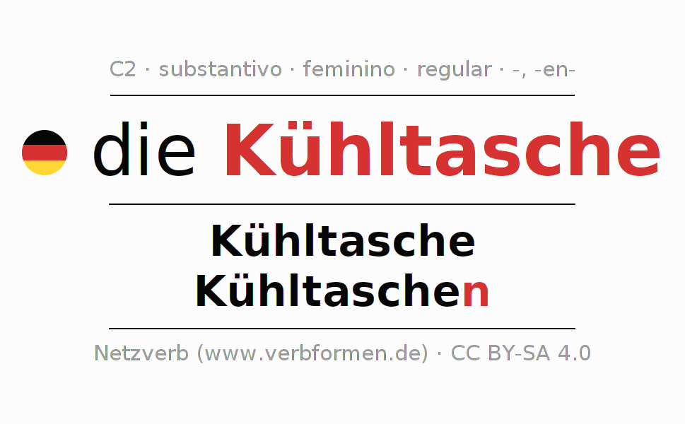 Declinação de Kühltasche é apresentada em uma tabela com todas as formas no singular e no plural (plural) e em todos os quatro casos: nominativo (1º caso), genitivo (2º caso), dativo (3º caso) e acusativo (4º caso) . Especialmente para os alunos de alemão, a correta declinação da palavra Kühltasche é fundamental.