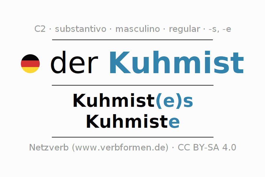 Declinação de Kuhmist é apresentada em uma tabela com todas as formas no singular e no plural (plural) e em todos os quatro casos: nominativo (1º caso), genitivo (2º caso), dativo (3º caso) e acusativo (4º caso) . Especialmente para os alunos de alemão, a correta declinação da palavra Kuhmist é fundamental.