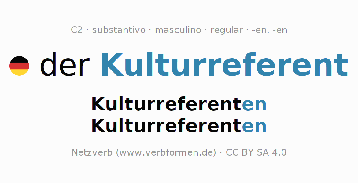 Declinação de Kulturreferent é apresentada em uma tabela com todas as formas no singular e no plural (plural) e em todos os quatro casos: nominativo (1º caso), genitivo (2º caso), dativo (3º caso) e acusativo (4º caso) . Especialmente para os alunos de alemão, a correta declinação da palavra Kulturreferent é fundamental.