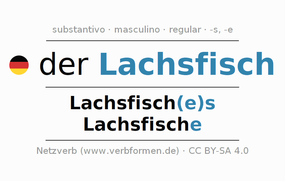 A declinação do substantivo Lachsfisch (salmóide) está no genitivo singular Lachsfisch(e)s e no nominativo plural Lachsfische . O substantivo forte Lachsfisch é declinado com a terminação es/e. O gênero gramatical de Lachsfisch é masculino e o artigo definido é 'der'. Não se pode somente declinar o substantivo Lachsfisch mas sim todos os substantivos em alemão. Comentários ☆