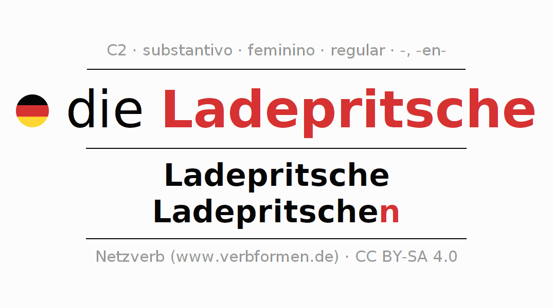 Declinação de Ladepritsche é apresentada em uma tabela com todas as formas no singular e no plural (plural) e em todos os quatro casos: nominativo (1º caso), genitivo (2º caso), dativo (3º caso) e acusativo (4º caso) . Especialmente para os alunos de alemão, a correta declinação da palavra Ladepritsche é fundamental.
