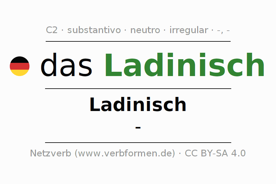 A declinação do substantivo Ladinisch (ladino) está no genitivo singular Ladinisch e no nominativo plural - . O substantivo Ladinisch é declinado com as terminações -/-. Não há formas no plural. O gênero gramatical de Ladinisch é neutro e o artigo definido é "das". Não se pode somente declinar o substantivo Ladinisch mas sim todos os substantivos em alemão. O substantivo faz parte do vocabulário referente ao Certificado em Alemão do Nível C2. Comentários ☆