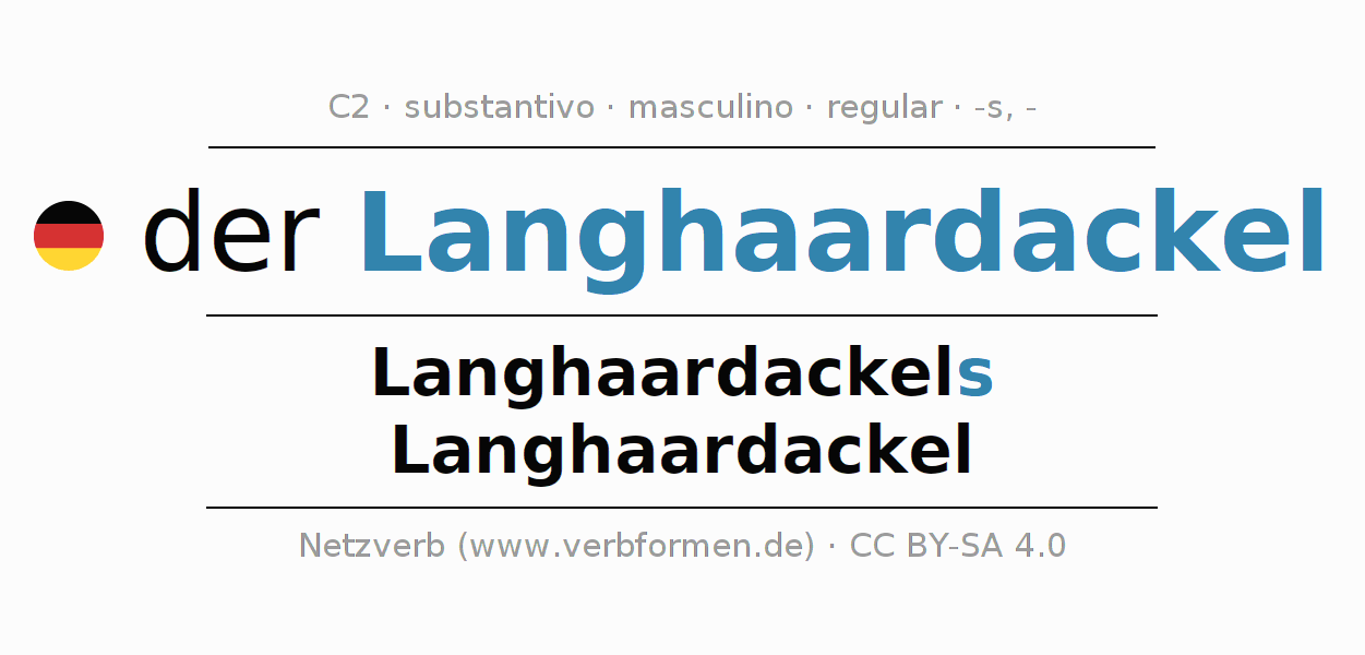 Declinação de Langhaardackel é apresentada em uma tabela com todas as formas no singular e no plural (plural) e em todos os quatro casos: nominativo (1º caso), genitivo (2º caso), dativo (3º caso) e acusativo (4º caso) . Especialmente para os alunos de alemão, a correta declinação da palavra Langhaardackel é fundamental.