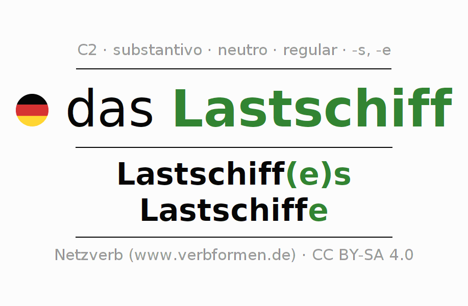 Declinação de Lastschiff é apresentada em uma tabela com todas as formas no singular e no plural (plural) e em todos os quatro casos: nominativo (1º caso), genitivo (2º caso), dativo (3º caso) e acusativo (4º caso) . Especialmente para os alunos de alemão, a correta declinação da palavra Lastschiff é fundamental.