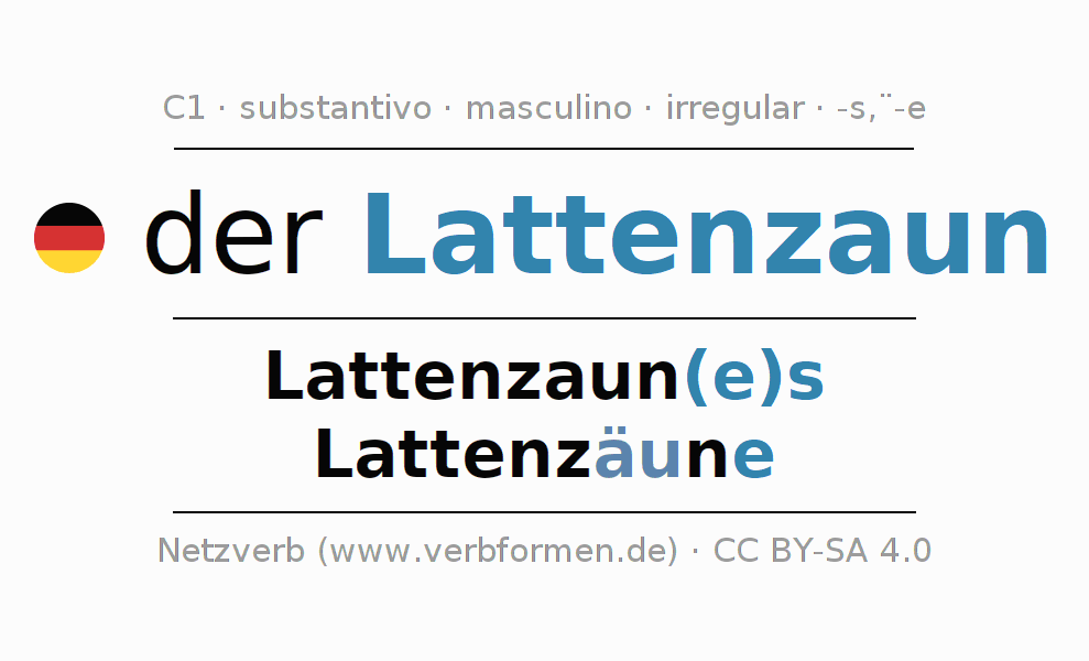 Declinação de Lattenzaun é apresentada em uma tabela com todas as formas no singular e no plural (plural) e em todos os quatro casos: nominativo (1º caso), genitivo (2º caso), dativo (3º caso) e acusativo (4º caso) . Especialmente para os alunos de alemão, a correta declinação da palavra Lattenzaun é fundamental.