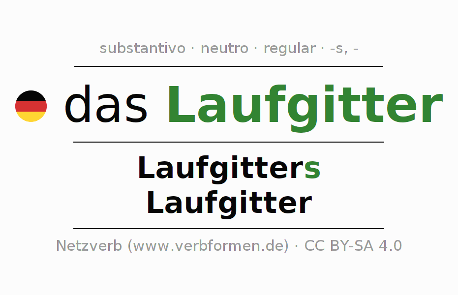A declinação do substantivo Laufgitter (cercadinho, cercado) está no genitivo singular Laufgitters e no nominativo plural Laufgitter . O substantivo forte Laufgitter é declinado com a terminação s/-. O gênero gramatical de Laufgitter é neutro e o artigo definido é "das". Não se pode somente declinar o substantivo Laufgitter mas sim todos os substantivos em alemão. Comentários ☆