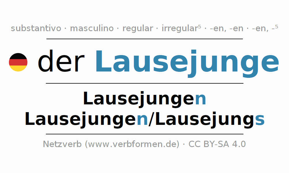 Declinação de Lausejunge é apresentada em uma tabela com todas as formas no singular e no plural (plural) e em todos os quatro casos: nominativo (1º caso), genitivo (2º caso), dativo (3º caso) e acusativo (4º caso) . Especialmente para os alunos de alemão, a correta declinação da palavra Lausejunge é fundamental.