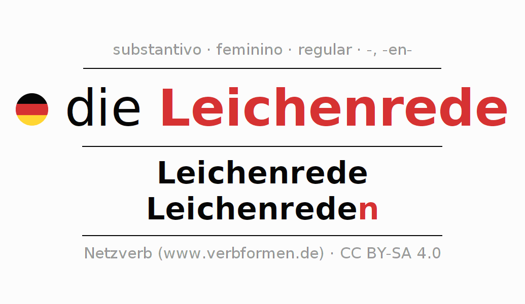 A declinação do substantivo Leichenrede (elogio fúnebre, discurso fúnebre) está no genitivo singular Leichenrede e no nominativo plural Leichenreden . O substantivo fraco Leichenrede é declinado com a terminação -/n. O gênero gramatical de Leichenrede é feminino e o artigo definido é "die". Não se pode somente declinar o substantivo Leichenrede mas sim todos os substantivos em alemão. Comentários ☆