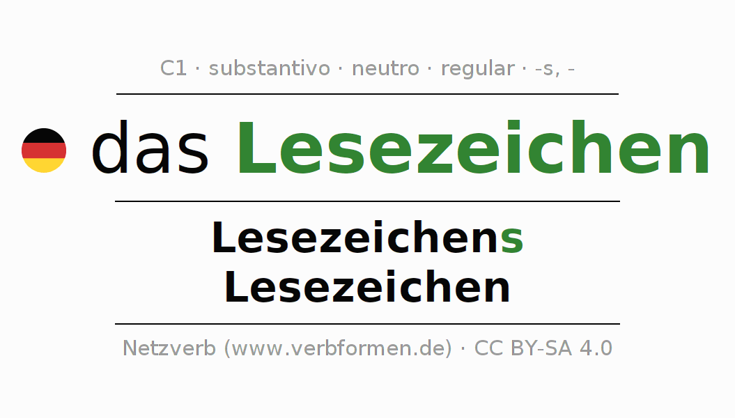 A declinação do substantivo Lesezeichen (favorito, marcador) está no genitivo singular Lesezeichens e no nominativo plural Lesezeichen . O substantivo forte Lesezeichen é declinado com a terminação s/-. O gênero gramatical de Lesezeichen é neutro e o artigo definido é "das". Não se pode somente declinar o substantivo Lesezeichen mas sim todos os substantivos em alemão. O substantivo faz parte do vocabulário referente ao Certificado em Alemão do Nível C1. Comentários ☆