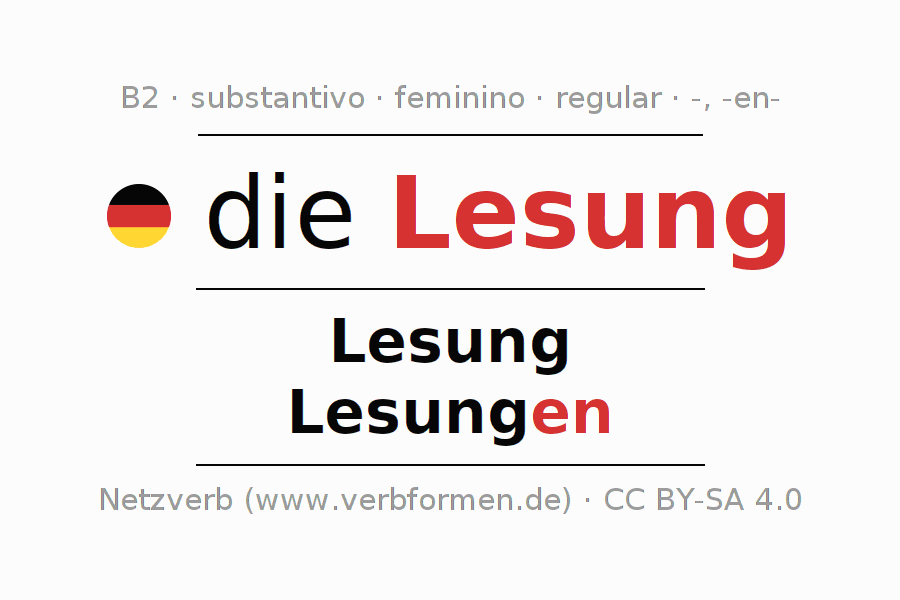 Declinação de Lesung é apresentada em uma tabela com todas as formas no singular e no plural (plural) e em todos os quatro casos: nominativo (1º caso), genitivo (2º caso), dativo (3º caso) e acusativo (4º caso) . Especialmente para os alunos de alemão, a correta declinação da palavra Lesung é fundamental.