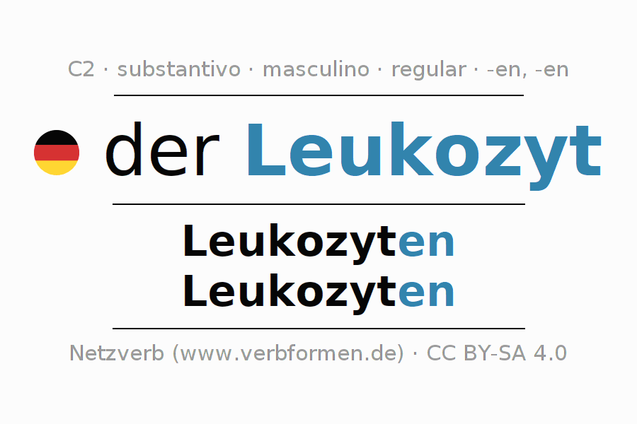 - Singular: der Leukozyt, des Leukozyten, dem Leukozyten, den Leukozyten
