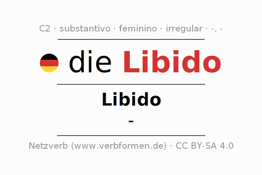 A declinação do substantivo Libido (desejo sexual, libido) está no genitivo singular Libido e no nominativo plural - . O substantivo Libido é declinado com as terminações -/-. Não há formas no plural. O gênero gramatical de Libido é feminino e o artigo definido é "die". Não se pode somente declinar o substantivo Libido mas sim todos os substantivos em alemão. O substantivo faz parte do vocabulário referente ao Certificado em Alemão do Nível C2. Comentários ☆