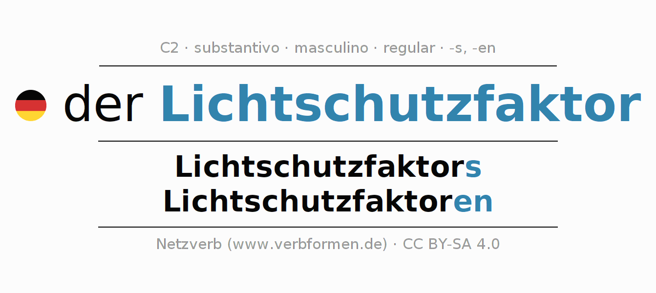- Singular: der Lichtschutzfaktor, des Lichtschutzfaktors, dem Lichtschutzfaktor, den Lichtschutzfaktor
