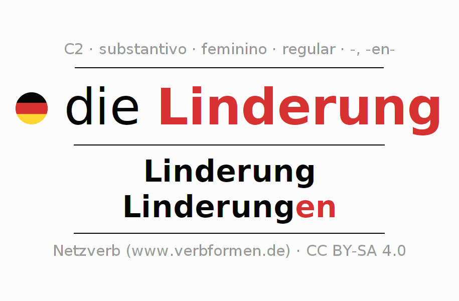 Declinação de Linderung é apresentada em uma tabela com todas as formas no singular e no plural (plural) e em todos os quatro casos: nominativo (1º caso), genitivo (2º caso), dativo (3º caso) e acusativo (4º caso) . Especialmente para os alunos de alemão, a correta declinação da palavra Linderung é fundamental.