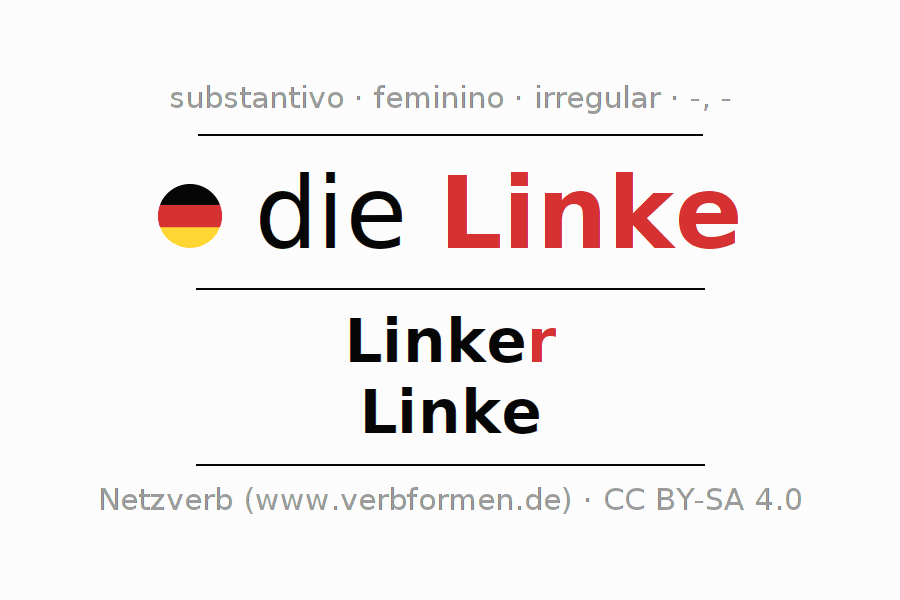 Declinação de Linke é apresentada em uma tabela com todas as formas no singular e no plural (plural) e em todos os quatro casos: nominativo (1º caso), genitivo (2º caso), dativo (3º caso) e acusativo (4º caso) . Especialmente para os alunos de alemão, a correta declinação da palavra Linke é fundamental.
